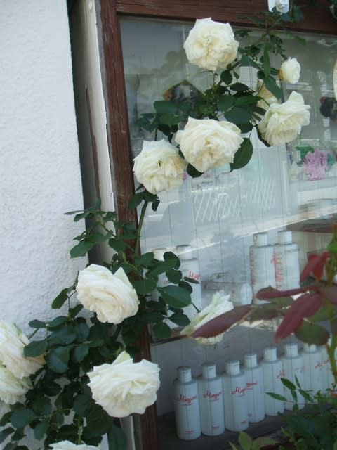 <めぐみのお花日誌>5月下旬の、ピエールドゥロンサールです!優雅ですね!めぐみ薬局の玄関で、ルリマツリ達と一緒に、一日中辻井伸行さんのピアノを聴いています!