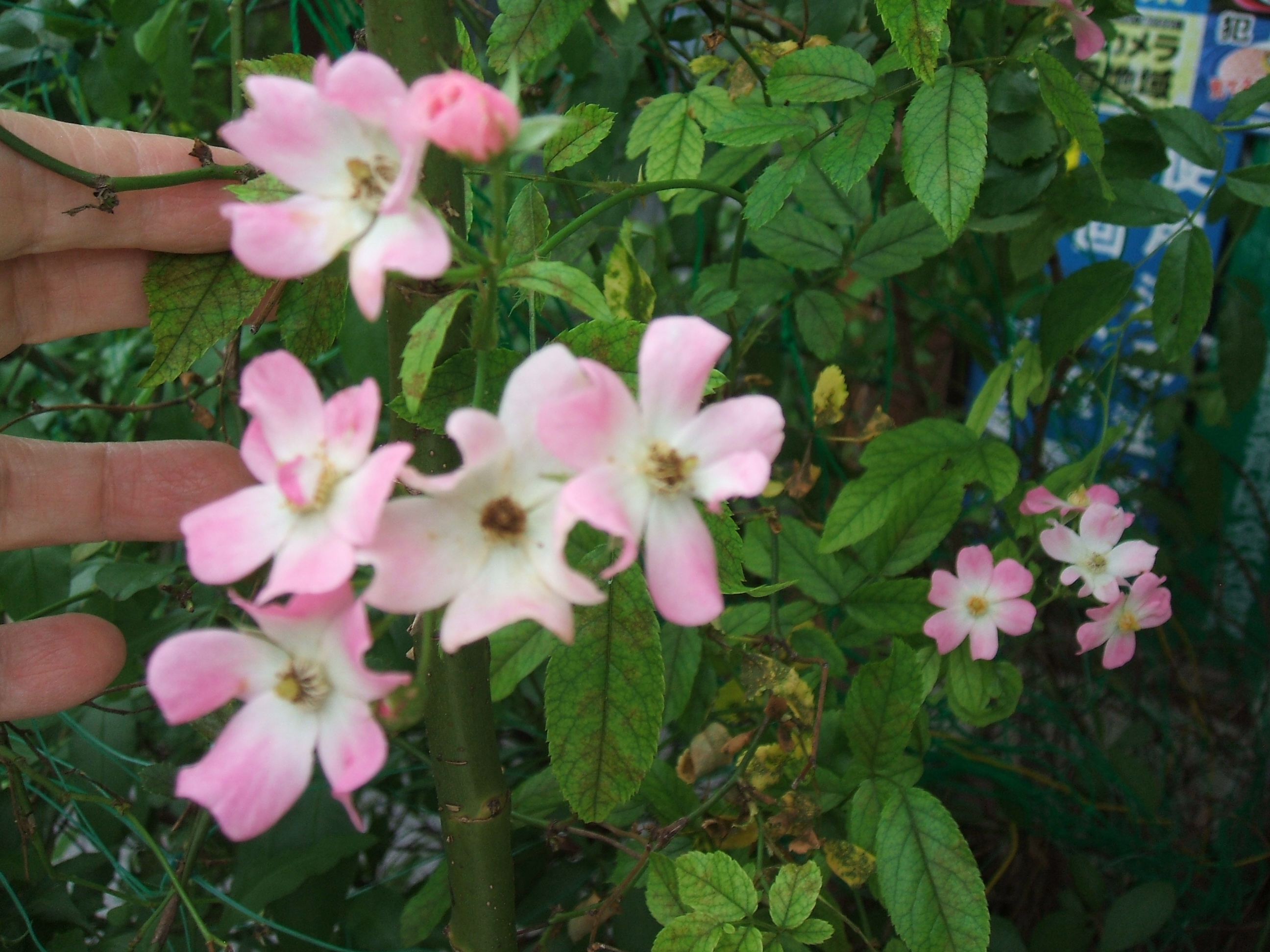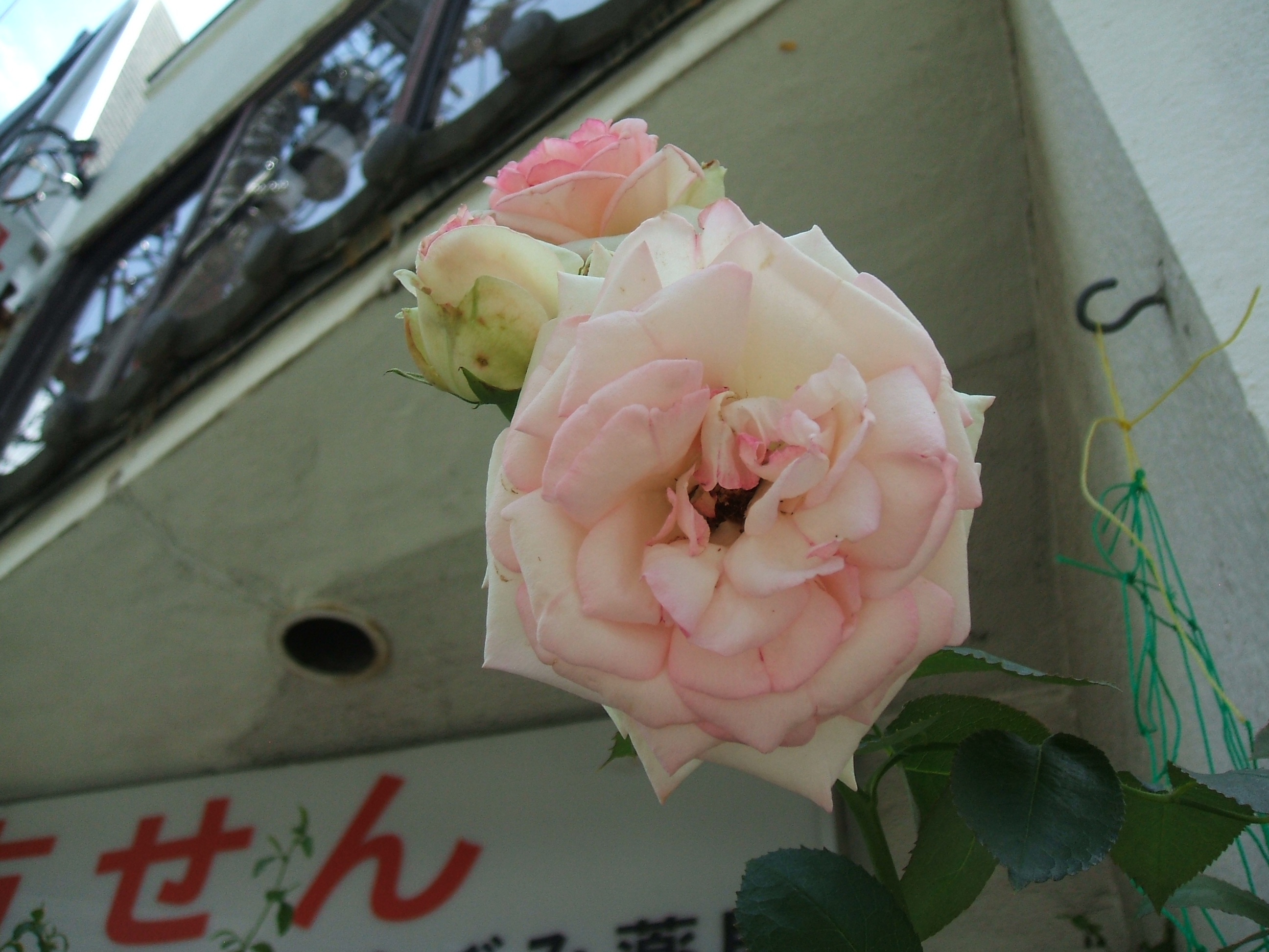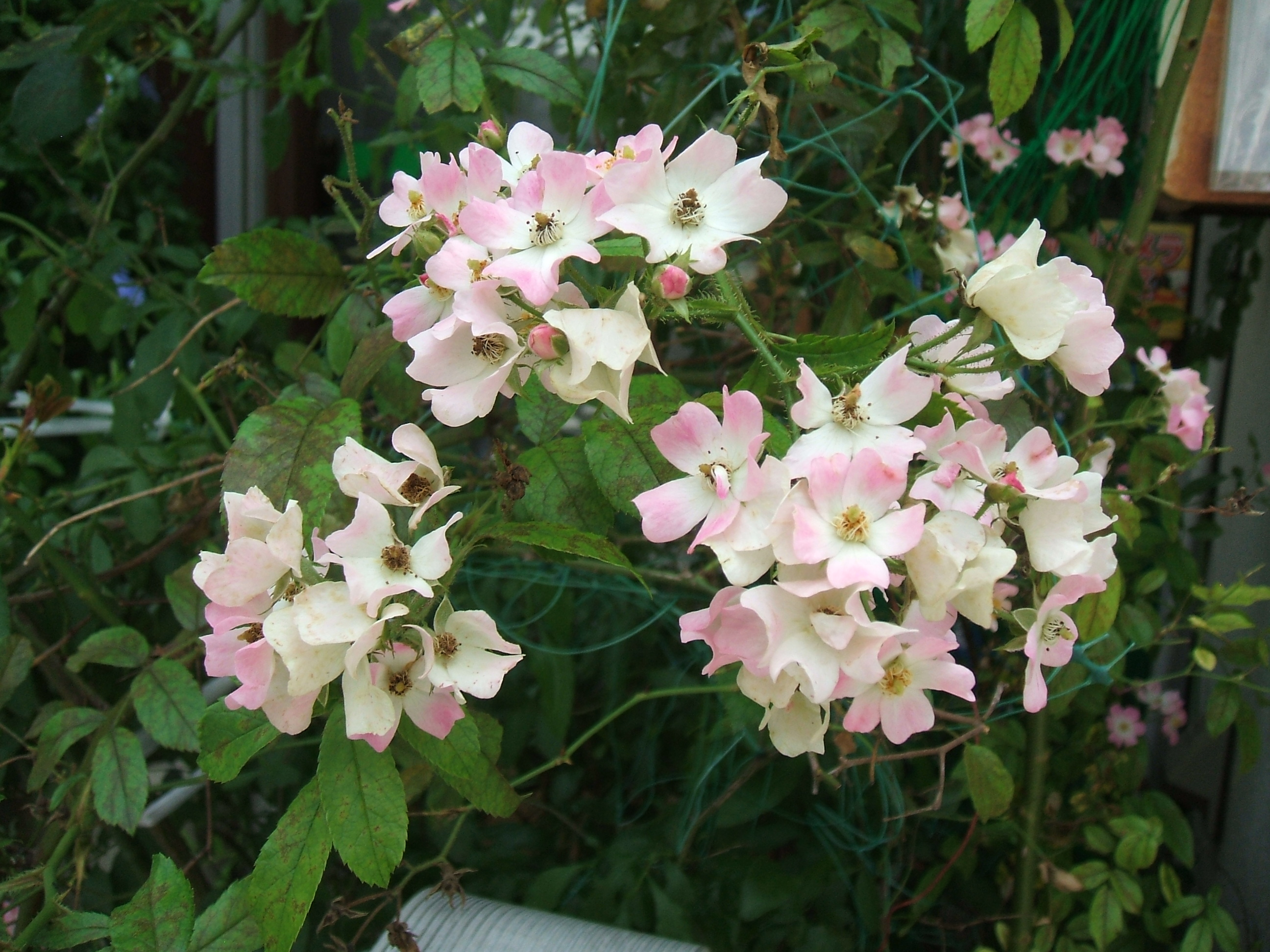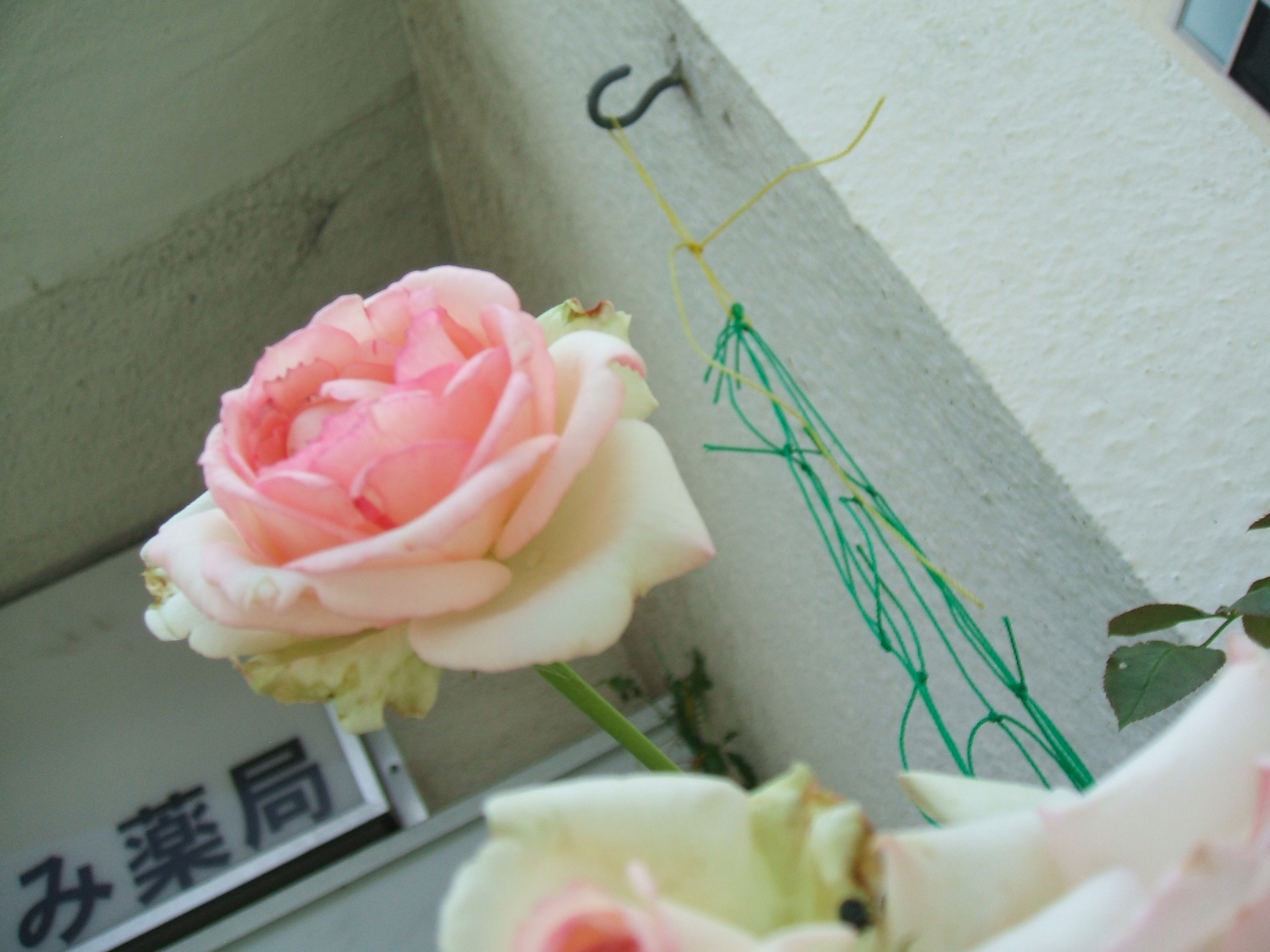 <めぐみのお花日誌>3年前の6月下旬の、ピエールドゥロンサール・バレリーナです!優雅ですね!めぐみ薬局の玄関で、一日中辻井伸行さんのピアノを聴いていました!